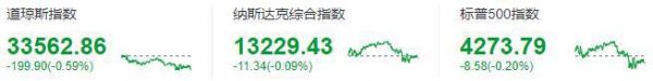 道琼斯指数收于33562.86点,下跌199.90点,跌幅0.59%;标准普尔500指数收于4273.79点,跌幅0.20%;纳斯达克指数收于13229.43点,跌幅0.09%。