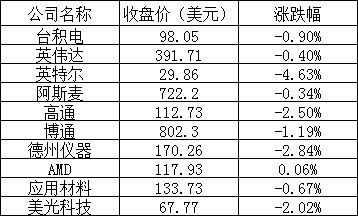 芯片龙头股普遍下跌,英特尔跌幅超过4%,高通、德州仪器和美光跌幅超过2%,英伟达跌幅不到1%。