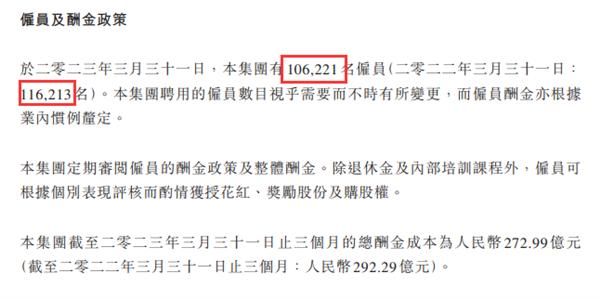 根据腾讯今年第一季度的财报,截至2023年3月31日,腾讯员工数量已减少至106,221人,较去年3月底的116,213人减少了近1万人,员工数量下降了8.6%。