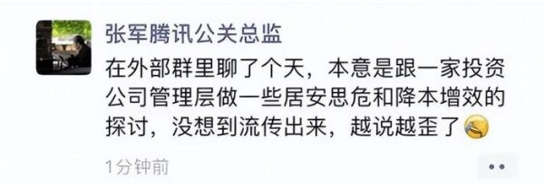 对此,腾讯公关总监张军在朋友圈澄清,这次讲话并非马化腾对公司内部人员的讲话,而是马化腾与一家投资公司的管理层讨论的内容。