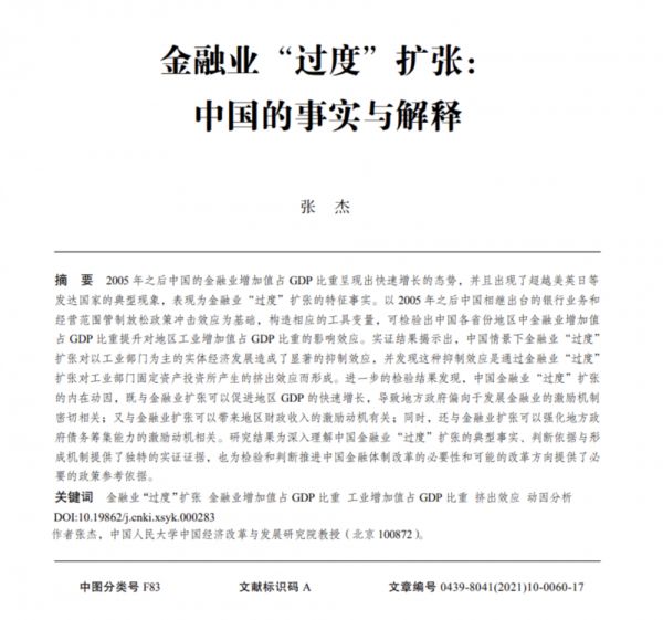 很显然,我国没有出现这样的自发调节,经济下行多年后“金G比”依然高企,所以背后有更深层次的东西值得研究。因此,我们今天介绍的这篇中国人民大学中国经济改革与发展研究院张杰教授的《金融业“过度”扩张:中国的事实与解释》(发表于《学术月刊》2021年第10期,以下简称《论文》),为我们揭示了这背后的真相。