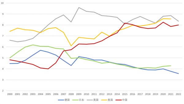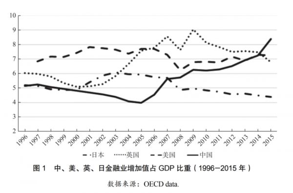 图:中、美、英、德、日金融业增加值占GDP比重(2000-2022年),数据来源:OECD data,数值及统计口径或与《论文》略有差异