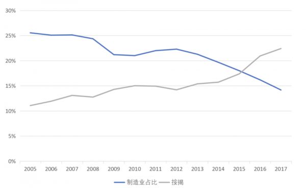 金融业脱实向虚,资金大量涌向房地产、城投(底层是基建),而投向制造业的比重下降。而监管一直严格限制银行资金投向房地产、城投,因此很多业务是借道通道或影子银行完成的,中间商要收差价,因此增加了业务成本,导致金融业收取的费用比正常业务更高。