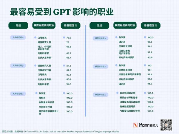 始作俑者 OPEN AI 自己也发布了报告,列举了不少最容易被 ChatGPT 影响的职业,其中有不少曾经被认为是白领甚至是金领的职业面临被取代的风险。
