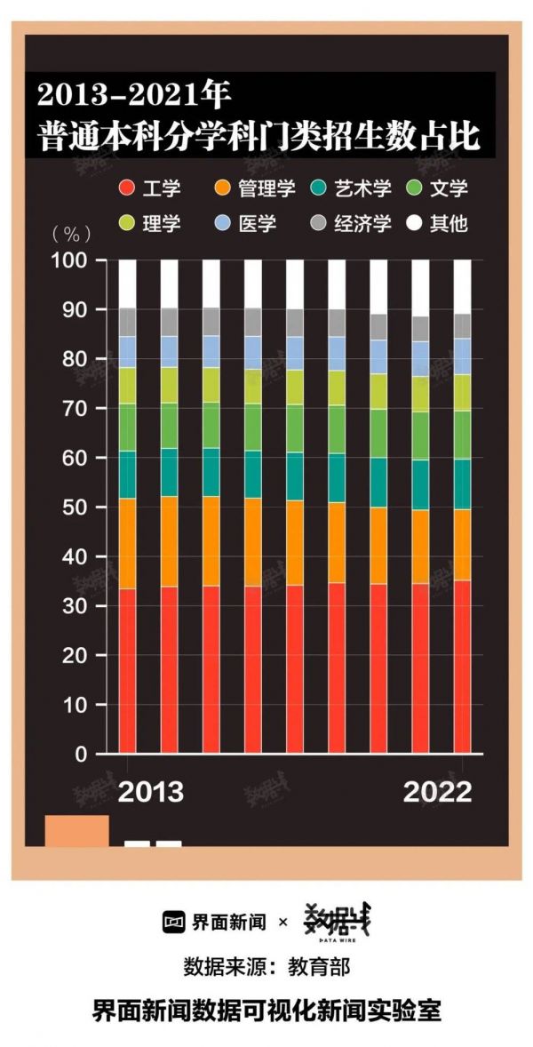过去9年,工学、管理学、艺术学是本科招生最多的三个学科。工学、艺术学越来越火,管理学人气正在下滑。2013~2021年,工学招生人数占比9年间提高1.7个百分点。同期,艺术学招生占比增加0.5个百分点,管理学招生占比则下降3.9个百分点。