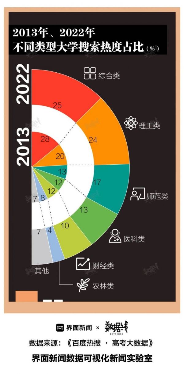 不同类型高校热度也呈相同变化趋势。过去10年,理工类大学搜索热度提高4个百分点,医科类大学热度提高1个百分点,财经类大学热度则下降两个百分点。