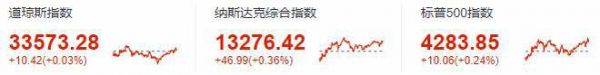 道琼斯指数收于33573.28点,上涨10.42点,涨幅0.03%;标准普尔500指数收于4283.85点,涨幅0.24%;纳斯达克指数收于13276.42点,涨幅0.36%。