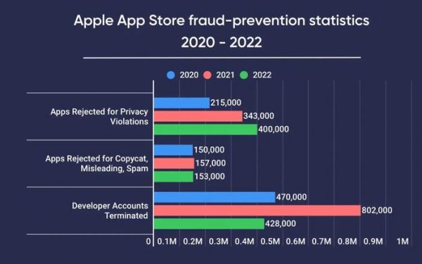 苹果日益关注侵犯用户隐私问题,因该问题拒绝开发者应用申请数量从 2020 年的 21.5 万款,到 2022 年升级到 40 万款。