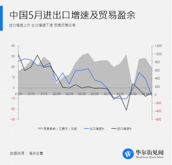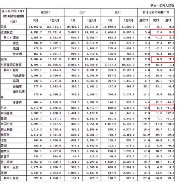 按美元计价,今年前5个月我国进出口总值2.44万亿美元,下降2.8%。其中,出口1.4万亿美元,增长0.3%;进口1.04万亿美元,下降6.7%;贸易顺差3594.8亿美元,扩大27.8%。