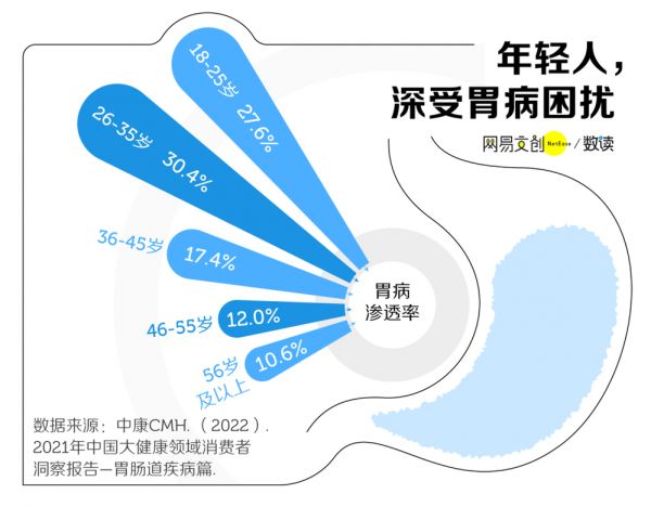 俗话说“十胃九病”,而如今,胃病越来越“年轻化”了。按照健康产业数据和咨询服务平台——中康 CMH 的调研数据,胃病在 18~35 岁的青壮年群体中的渗透率约为 30%,比起中老年更为高发 [5]。