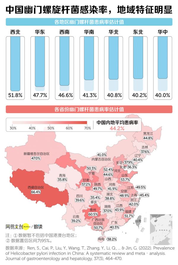 虽然中国内地幽门螺杆菌的感染率在过去的几十年里一直在下降,但仍然保持在 44.2% 的水平,相当于有 6.2 亿人感染 [15][16]。即使是患病率最低的华中地区,也大约有一亿人感染 [15]。