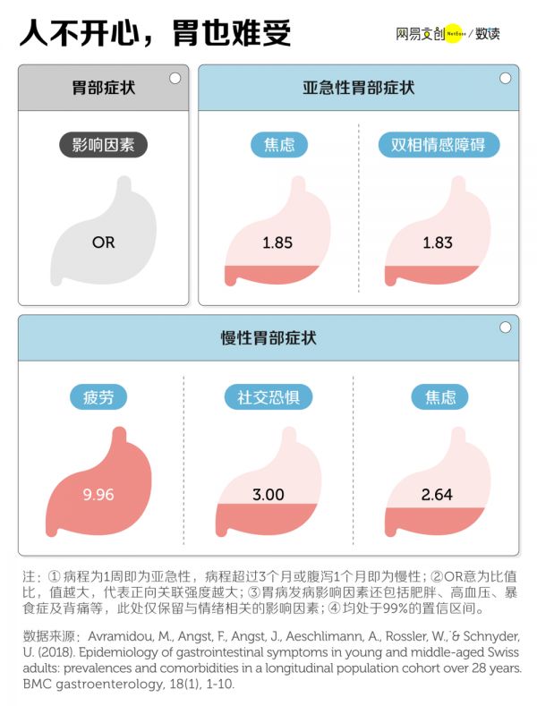 胃是情绪器官,胃肠道不适症状经常伴随着不良的情绪状况 [23]。换句话说,当你感到焦虑、心累时,你的胃也同样在“尖叫、扭曲”。