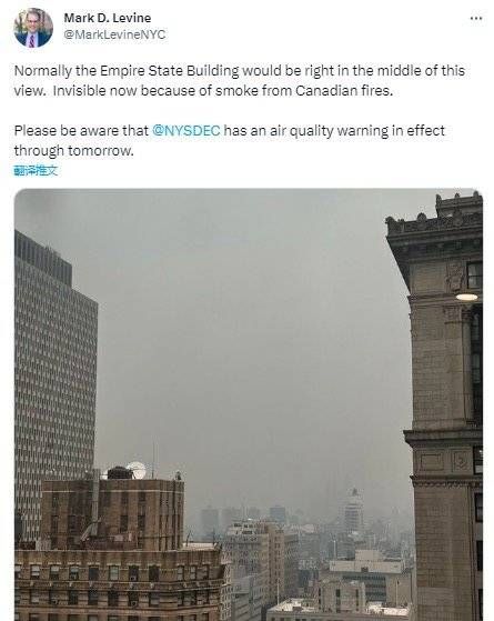 曼哈顿区长Mark Levine在推特上发布了一张从他的办公室拍摄的烟雾弥漫的天际线照片,并指出烟雾几乎完全遮蔽了帝国大厦。他写道,“由于加拿大野火产生的烟雾,现在什么都看不见了。”