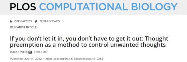 Fradkin, Isaac, and Eran Eldar. "If you don’t let it in, you don’t have to get it out: Thought preemption as a method to control unwanted thoughts." PLoS Computational Biology 18.7 (2022): e1010285. https://doi.org/10.1371/journal.pcbi.1010285