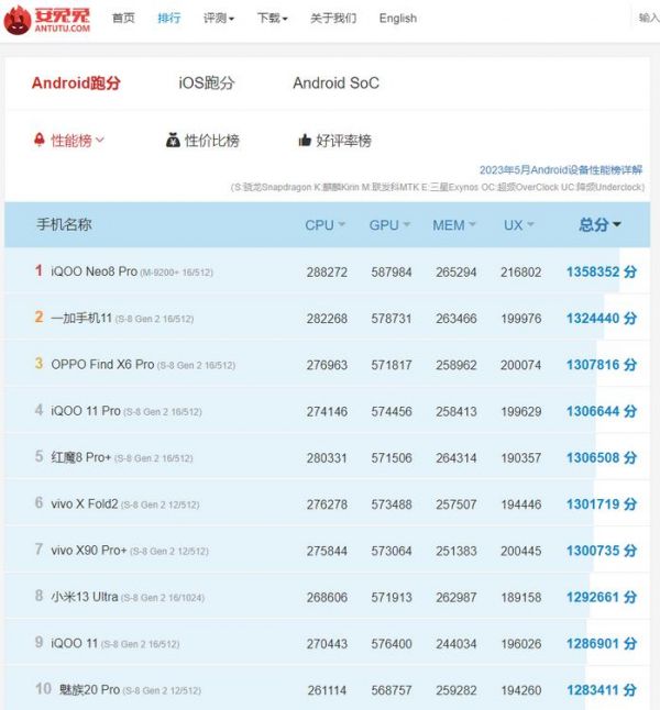 2023年3月安兔兔安卓旗舰性能榜出炉,高通骁龙8Gen2再屠榜