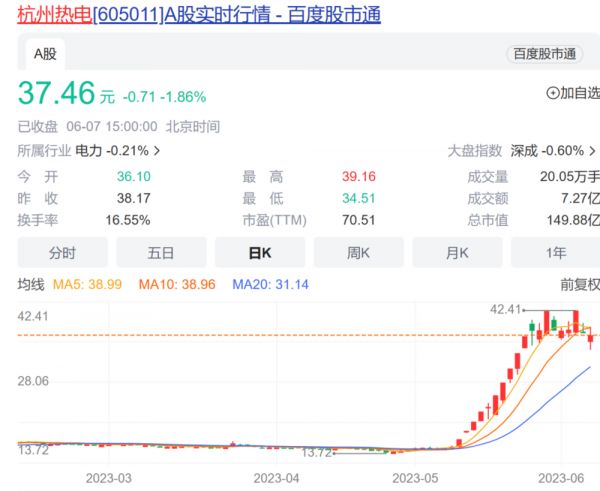 6月6日,杭州热电走出跌停,6月7日,该股收跌1.86%,报37.46元/股。