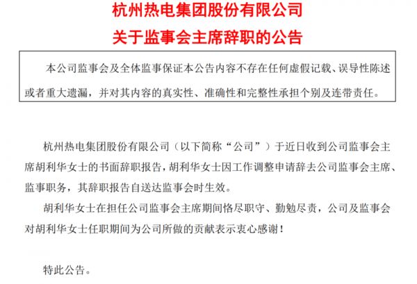 对于两位高管辞职,杭州热电也表示,许阳在担任公司董事长期间恪尽职守、勤勉尽责,公司及董事会对许阳任职期间为公司所做的贡献表示衷心感谢;胡利华在担任公司监事会主席期间恪尽职守、勤勉尽责,公司及监事会对胡利华任职期间为公司所做的贡献表示衷心感谢。