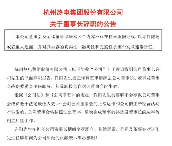 6月7日晚间杭州热电发布公告显示,近日收到公司董事长许阳的书面辞职报告,许阳因工作调整申请辞去公司董事长、董事及董事会战略委员会主任职务,其辞职报告自送达董事会时生效。