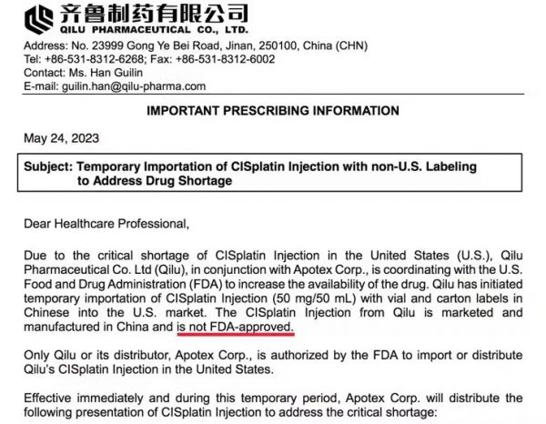 复盘一下此事,其实是在今年3月,齐鲁制药收到FDA顺铂缺货的紧急邮件。缺货的原因,是生产顺铂的印度公司掉链子了,无法提供药品。