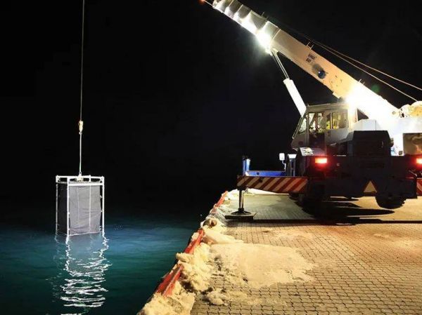 在海洋实验室旁边的港口,Geoffroy的一位博士生Muriel Dunn正在研究浮游动物和鱼类在受到光照时如何移动。她还在使用机器学习算法,通过反射的声音频率模式来识别生物。在码头另一端,一台起重机吊着一只巴士大小的铁笼子。笼子浸在水里,外面包裹着网,以防止浮游动物和鱼类在测试时逃跑。