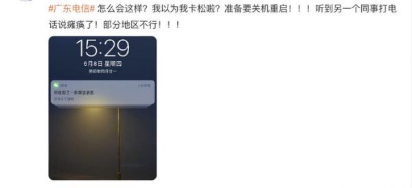 IT之家6 月 8 日消息,有多名用户称广东电信网络出现故障中断,具体表现为手机没信号,无法连接移动网络,无法拨打电话和收发短信,拨打电信 10000 号提示无法连接网络,在手机中的服务状态显示不在服务区,已断开移动网络。