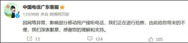 随后,@中国电信广东客服 发文称,因网络异常,影响部分移动用户接听电话,我们正在进行抢修,由此给您带来的不便,我们深表歉意,感谢您的理解和支持。