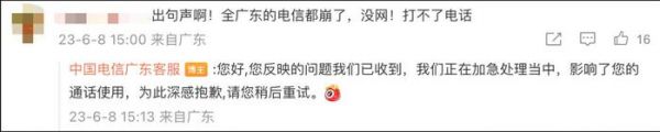 此前@中国电信广东客服 在微博评论区回应称:因业务异常,影响您接听语音和无法接收短信,我们正在加急处理,为此深感抱歉。