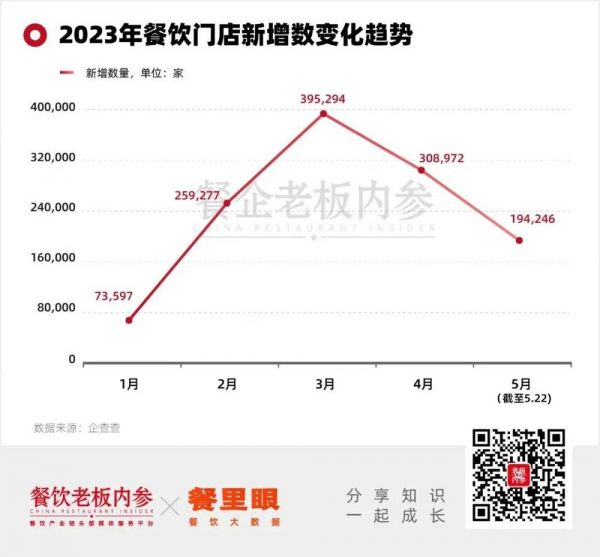 根据企查查数据显示,2023年1月1日~5月22日,全国餐饮新增123.13万家。其中1月份新增73597家;2月份开始进入“狂飙”,新增259277家;3月份新增395294家;4月份开始回落,但也有308972家;5月份统计了22天,新增194246家。
