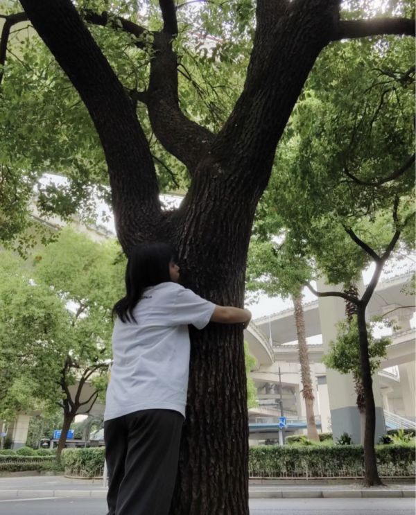 与亲近的人拥抱和与树的拥抱有所不同,与人的拥抱,她会时常担忧对方是否能支撑住自己倾吐给他的焦虑和负能量,因此她也难以估测自己是否会被理解、治愈。但与大树拥抱,它会沉默且耐心地听你说完内心话。