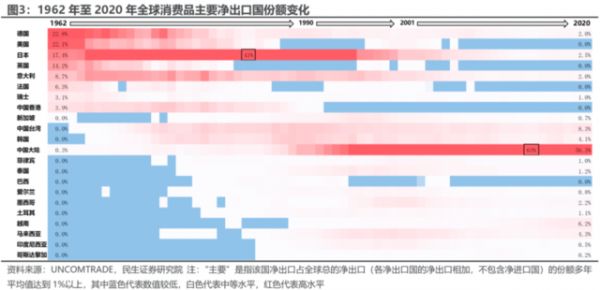 1962年时,美国、德国、日本是最大的三个净出口国,而在此后的接近30年时间里,美国、德国、英国的份额逐渐被位于中间的日本所占据,到1984年时,日本的净出口占全球净出口总和达到历史最高点43%,成为名副其实的制造业“巨头”;