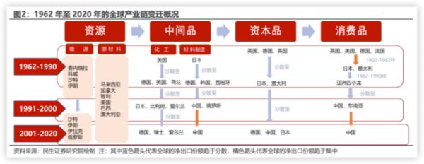 民生证券分析师牟一凌指出,从全球最终消费品的生产来看,产业链转移主要经历了“西方国家分散生产 ——日本一家独大——亚洲国家分散生产——中国一家独大”的过程。