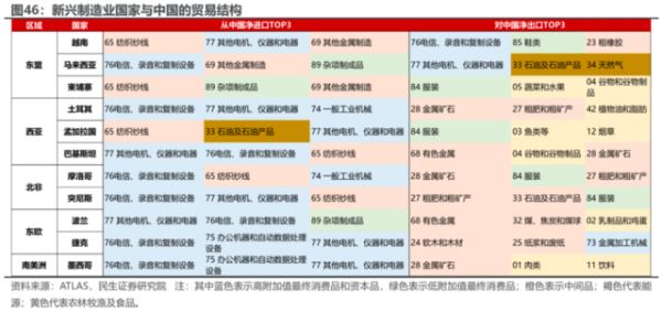 对新兴制造业国家而言,中国能够与它们达成的互惠关系,则是中国让渡一部分“低附加值”商品的净出口份额给新兴制造业国家,并向它们提供设备和技术出口,这个过程中后者因贸易获得经济增长动能,同时,对中国来说,也培育了一个新兴的消费市场。