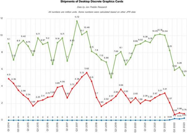 IT之家 6 月 8 日消息,Jon Peddie Research 发布了最新的研究报告。数据显示,2023 年第一季度,AIB 显卡市场的出货量下降了 12.6%,同比下降 38.2%,AIB 总体出货量约为 630 万块。