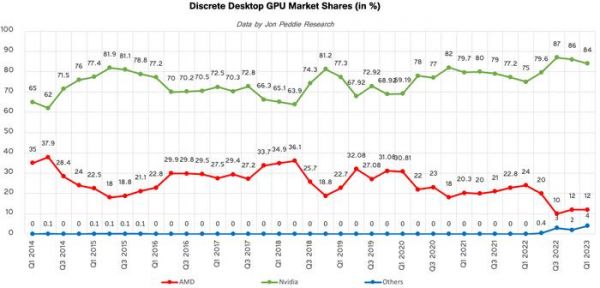 Nvidia 的季度单位出货量下降了 15.2%。英伟达继续以 83.7% 的市场份额占据主导地位。
