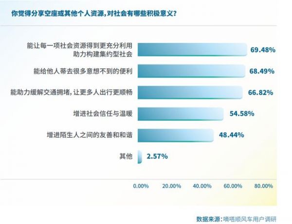 据调研,高达69.48%的受访用户认同,鼓励分享“让社会资源更充分利用,助力构建集约型社会”,同时,分享空座在便利他人、缓解交通拥堵、增进社会信任与温暖、增进友善与和谐这四方面的积极意义,也得到高度认同。