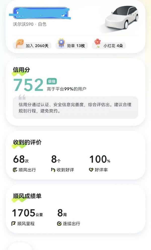 为增进车乘之间的相互信任,嘀嗒出行建立了一套完备的顺风车信用分体系及行为规则,同时,每位用户还有专门的个人主页展示,包括信用分、小红花朵数、好评率、获得的勋章、合乘评价标签等。