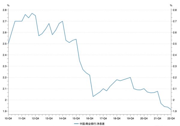 这背后是近年来银行逐渐显露的息差压力。银保监会数据显示,2022年底,商业银行整体净息差为1.91%,同比下降17个基点,这是自2010年以来净息差首次跌破2%。