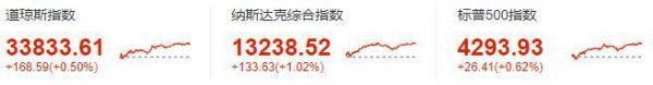 道琼斯指数收于33833.61点,上涨168.59点,涨幅0.50%;标准普尔500指数收于4293.93点,涨幅0.62%;纳斯达克指数收于13238.52点,涨幅1.02%。