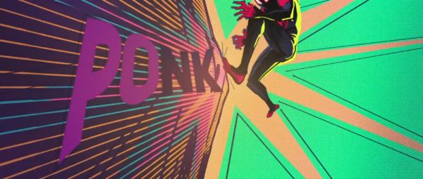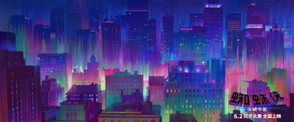 格温所在的宇宙看起来由水彩构成,光影色调配合她渴望被接纳却又恐惧抛弃的内心世界流转;迈尔斯所在的纽约则让人想起近几年被频繁讨论的赛博朋克世界里的上城区,把霓虹灯和潮湿的地面当作跳跃的背景;朋克蜘蛛侠霍比则由充满线条的拼贴画组成,酷成只存在于纸媒时代流行杂志里的人。更不用提那个格温和迈尔斯倒挂在都市寰宇的时刻,当这些场景接连浮上银幕,似乎再富丽的语言也难以复现我们目睹它时的感官震撼。