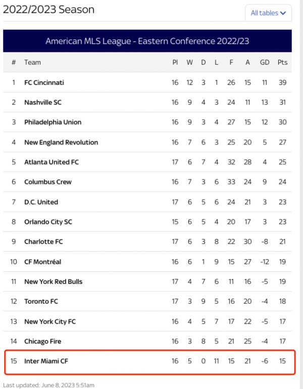 2022/23赛季,迈阿密国际在联赛中排名东部垫底