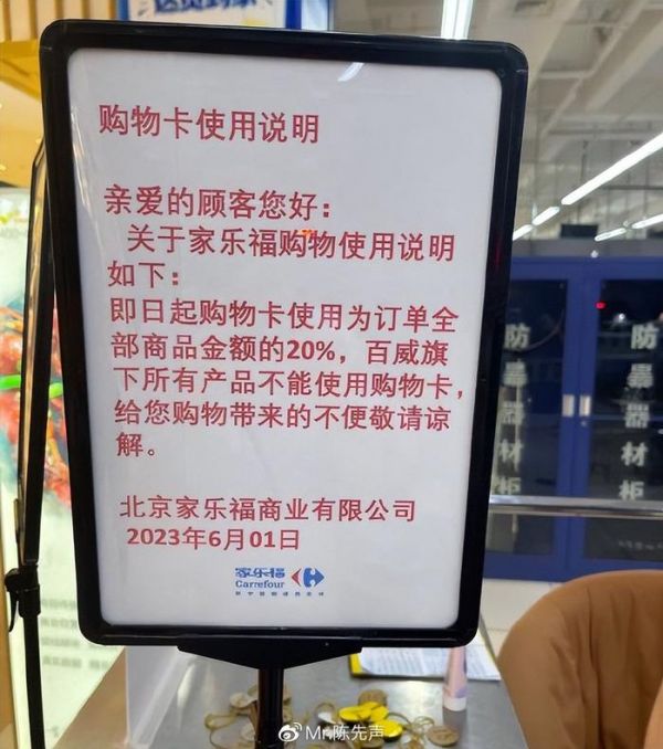 据《财新》报道,北京多家门店结帐台均有放置提示板,同时喇叭播放语音,提示称:即日起使用购物卡结账时可用额度为总金额的20%,其余金额需要用其他支付方式另行支付。部分门店储值卡不可用于小家电产品。