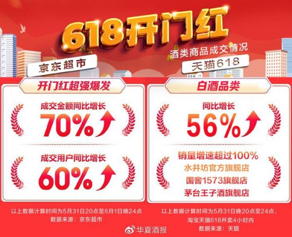 数据显示,5月31日20点至6月1日晚24点,京东超市618开门红28小时,酒类商品成交额同比增长70%,成交用户同比增长60%,白酒、葡萄酒、洋酒、啤酒等细分品类均实现突破。