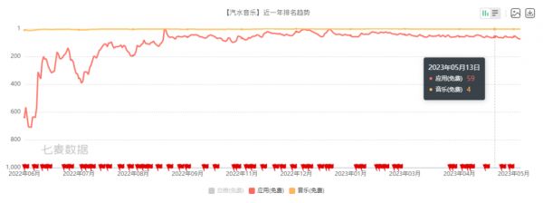 (七麦数据:苹果商店中汽水音乐近一年排名趋势)