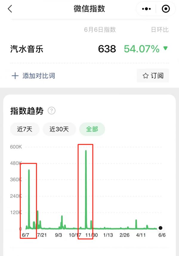 (在微信指数上,能清晰看到汽水音乐两拨高潮分别对应6月上线和11月3.0版本更新)
