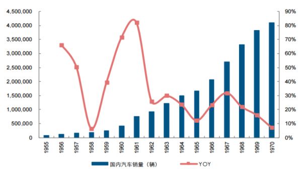 国内汽车的销量由1960年的40万左右跃升至1970年的400多万,实现了十倍的高速增长。期间,日本在1966年汽车产量超过了英国,挤进全球前三的位置。