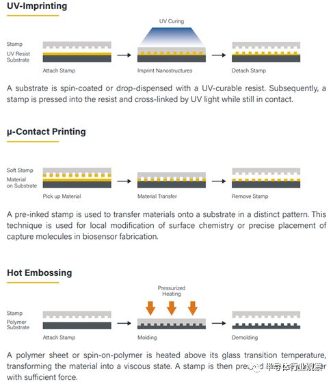 NIL的这种特性更像是以敲印章的方式实现快速和批量的图形复制和转印,也更接近于光刻(lithography)的本源印刷技术。通过20多年的发展,NIL在晶圆级光学系统(WLO)的制作中已经被广泛应用,具有卷对卷,卷对晶圆等不同的压印方式。在集成电路制作的背景下,主要使用母版对晶圆的压印方式,在这种压印方式下,又可分为:紫外固化压印、微接触转移和热压印。