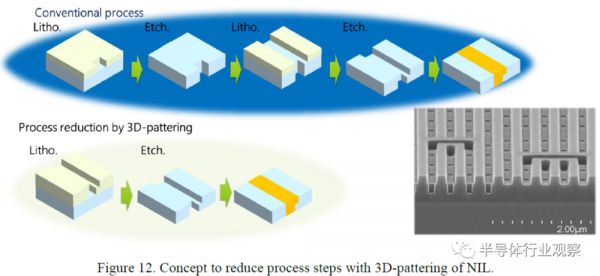 针对以上两项劣势,笔者认为在3D图形化的应用场景下其劣势并非那么明显。如上一节所述,通过减少曝光次数NIL也可以实现增加产出的效果,每当减少一次曝光便使其产出相对于光学光刻达到了倍增的效果。并且,由于3D图形的结构预先就已经设置在了母版上,因此层与层之间的套刻精度误差在理论上是0,也扩大了套刻精度误差的工艺窗口。