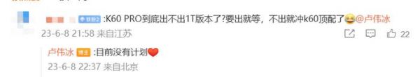 IT之家 6 月 9 日消息,有用户在微博上向卢伟冰询问“K60 PRO 到底出不出 1T 版本了? 要出就等,不出就冲 k60 顶配了”,卢伟冰表示目前没有计划。