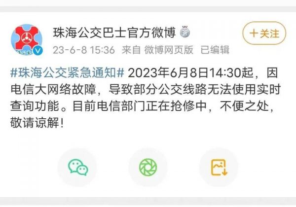 为此,珠海公交巴士官方社交媒体账号发布紧急通知显示,自6月8日14:30起,因电信大面积网络故障,导致部分公交线路无法使用实时查询功能。