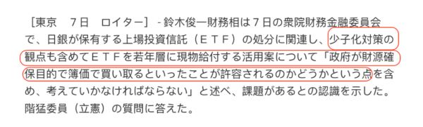 首先要明确,日本财相这是一个政治提案,目的是应对少子化趋势,购买日本央行手上的ETF是实现这一目标的手段之一;而不是像目前财经媒体报道所展现出的倾向:好像这件事关乎日本央行未来怎么处理手上的ETF。